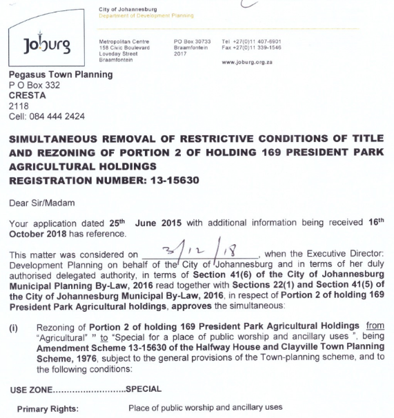 На 3ти Декември 2018, получихме официалния документ, в който имота на Сдружението, 30 Kruger road, President Park, Midrand е резониран от “Agricultural to Special – for a public worship and ancillary uses“. Което означава че след 3 години чакане, най-накрая ще можем да продължим с плановете по строежа на нашата Българска църква.